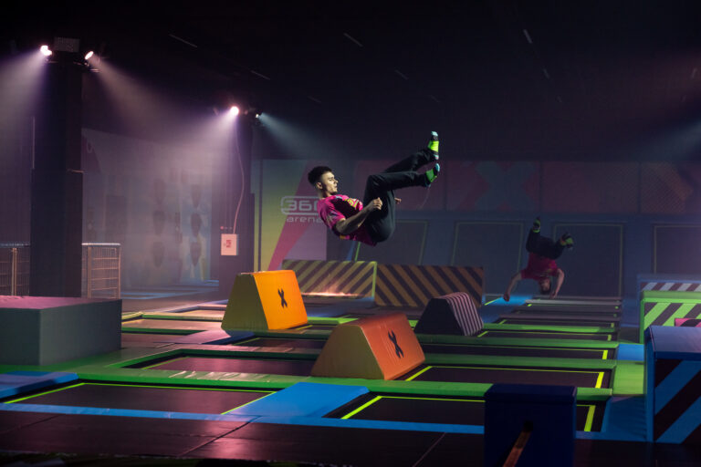 Nusiteikę smagiai pasportuoti „360 Arenoje“ ras „Performance“ akrobatinius batutus, „Airbag“, „Trapeeze“ ir „Battle beams“ zonas, taip pat „Ninja“ trasą, vulkaną, „Air track“ gimnastinę zoną, atskiras „Junior“ ir mažųjų zonas.